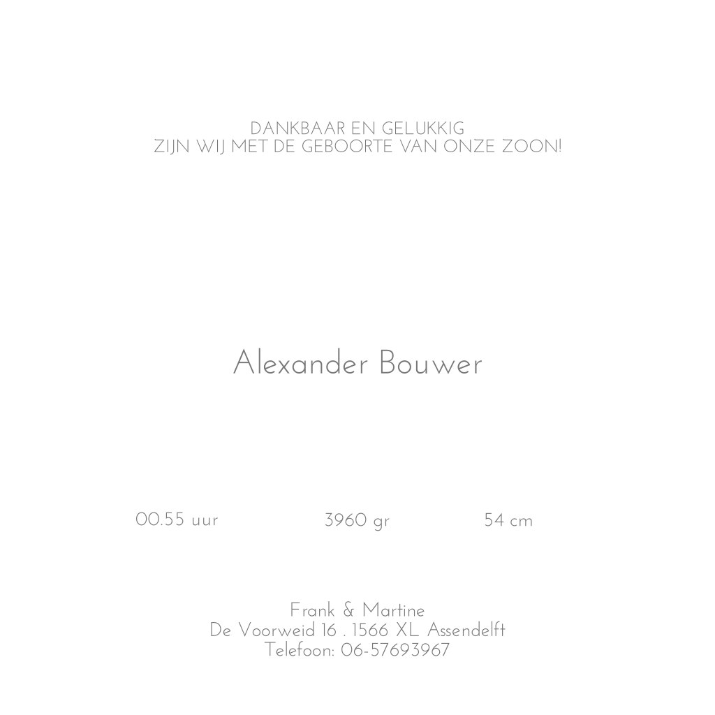 Schattig foto geboortekaartje voor je pasgeboren zoontje met hippe goudfolie details zoals een hartje, klokje en een weegschaal. Ook de babynaam wordt in goudfolie afgedrukt. Plaats mooie foto's van je zoon op de voorkant en aan de binnenkant van de kaart en maak zo je eigen geboortekaartje!