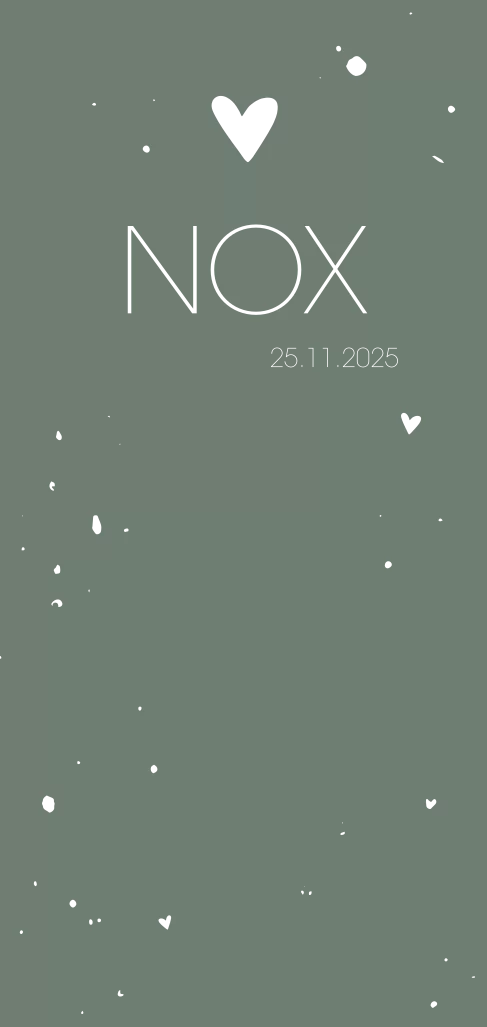 Een trendy geboortekaart voor een jongen met een hartje, spetters en de naam in goudfolie. De achtergrond heeft een trendy legergroene kleur.