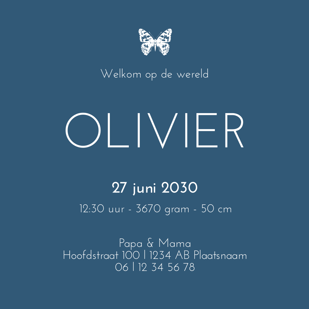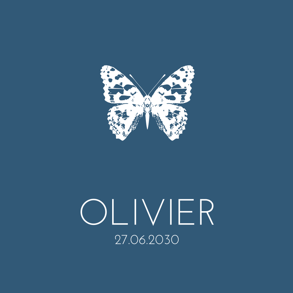 Stijlvol geboortekaartje voor je pasgeboren zoontje met een trendy design van een goudfolie vlindertje op een donkerblauwe achtergrond. Pas de kleuren van het folie of de achtergrond aan en maak zo een uniek ontwerp!