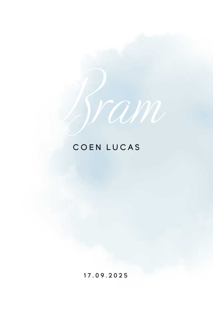 Klassiek en minimalistisch geboortekaartje voor jullie lieve zoontje met een aquarel verf vlek in licht blauw. De babynaam in goudfolie maakt dit kaartje echt stijlvol! Hebben jullie al een leuke jongens naam bedacht?