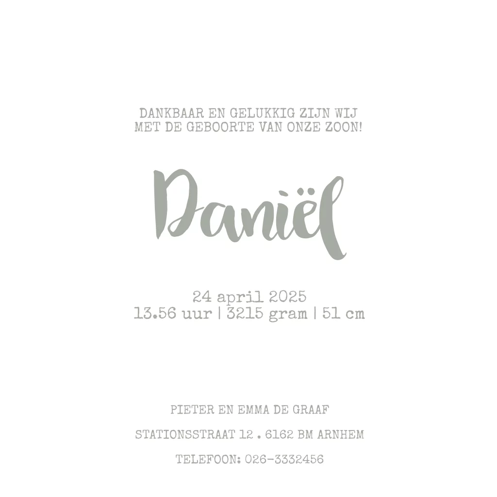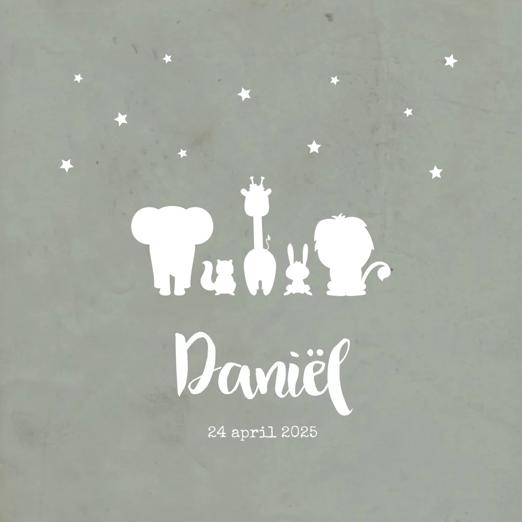 Hippe geboortekaart voor je pasgeboren zoon met jungle dieren zoals een olifant, eekhoorn, giraffe, konijn en leeuw in goudfolie op een stoere grijze achtergrond met sterretjes.