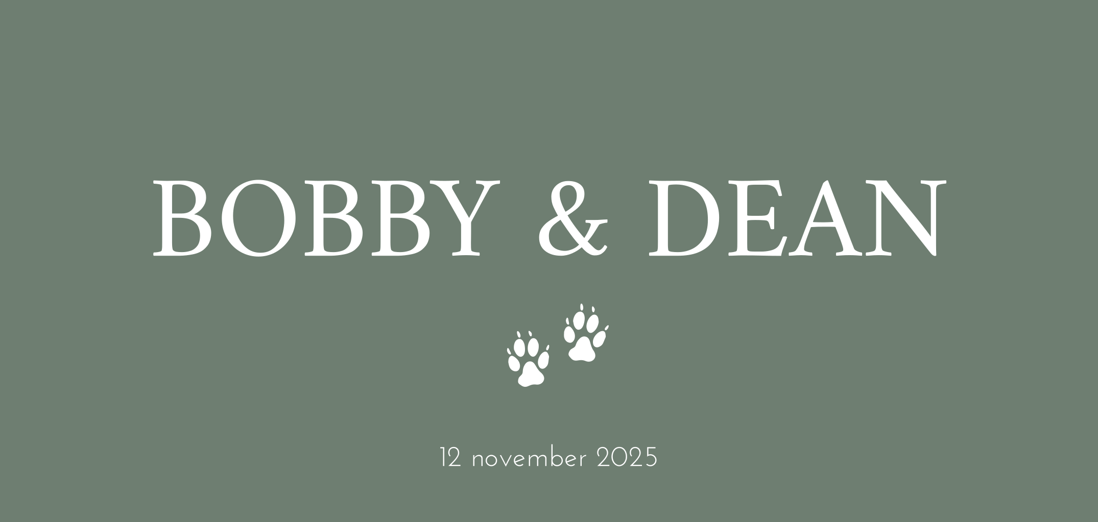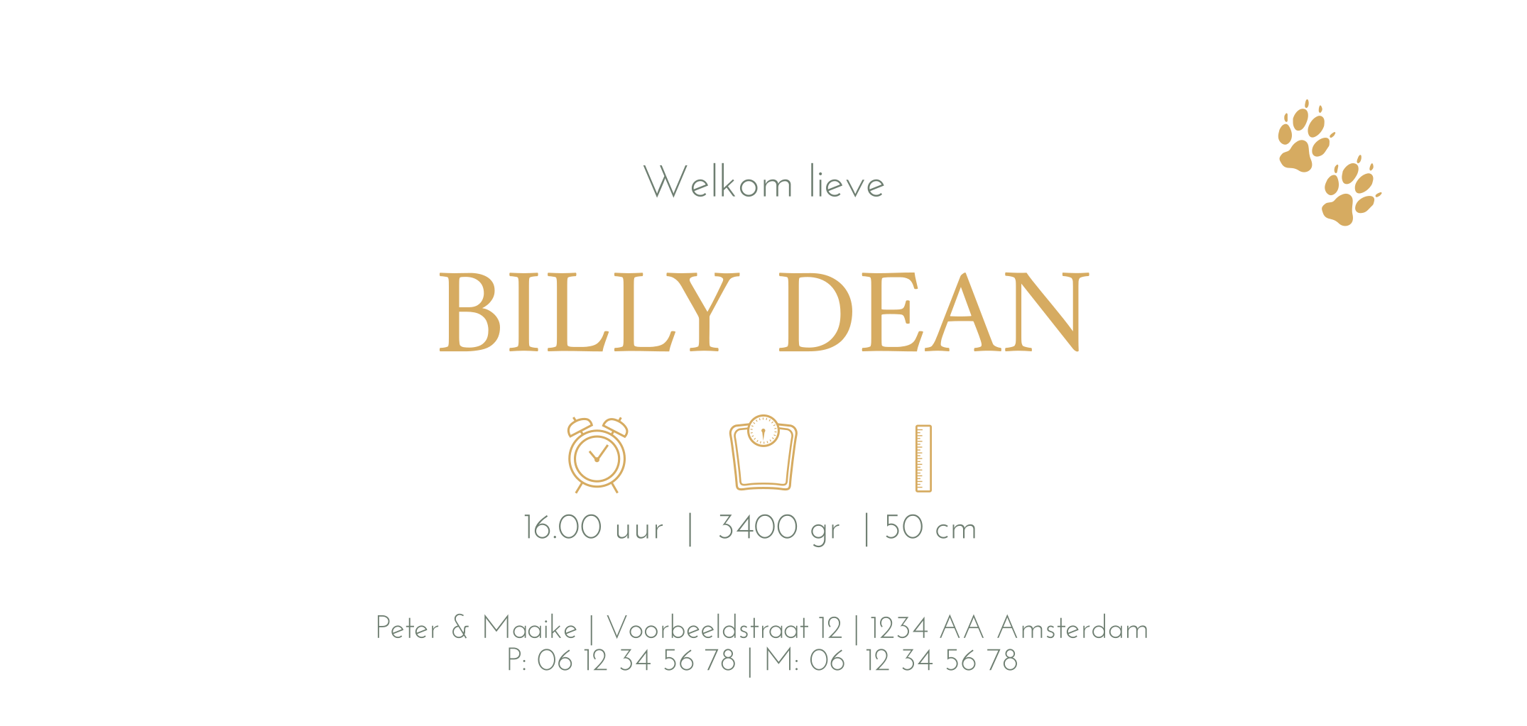 Stoer tweeling geboortekaartje voor de geboorte van je twee zoontjes met koperfolie honden pootjes op een olijfgroene achtergrond. Liever koperfolie of zilverfolie op een achtergrond met een andere trendkleur? Dit geboortekaartje kun je helemaal personaliseren in de online editor!