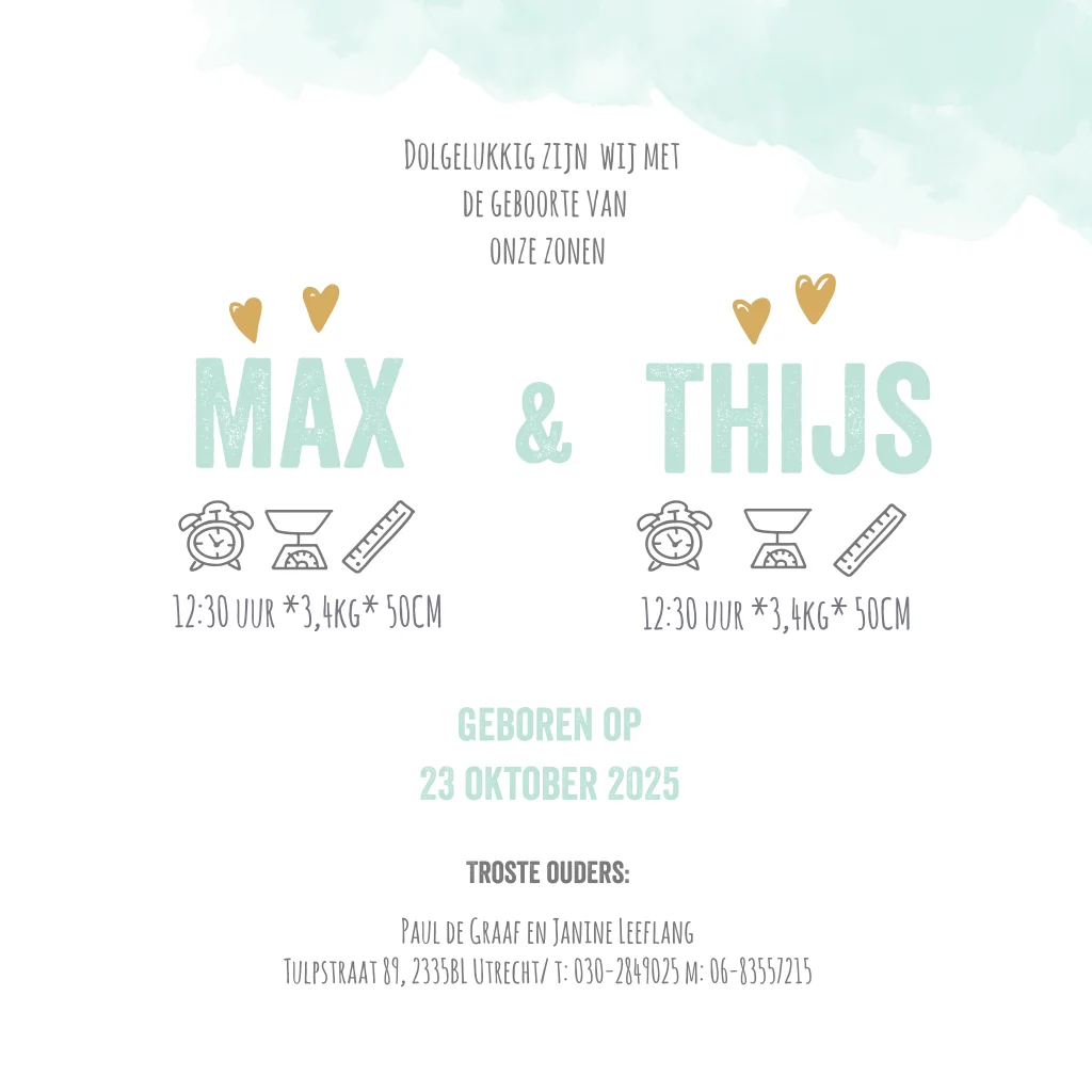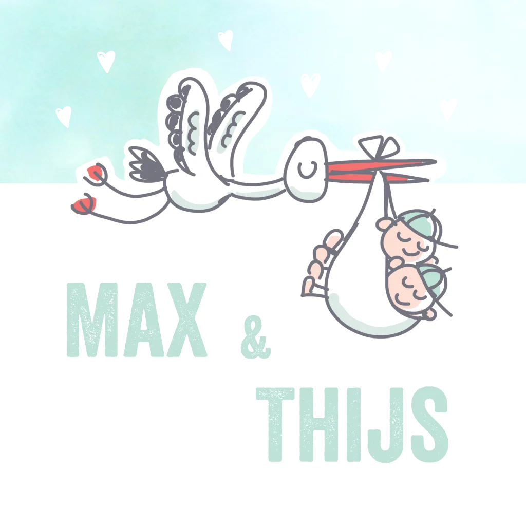 Grappig geboortekaartje voor de geboorte van je tweeling zonen met een vrolijke illustratie van een ooievaar. De goudfolie hartjes maken dit geboortekaartje helemaal af!