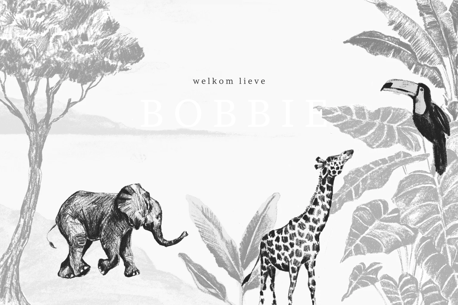 Een uniek zwart-wit kaartje voor de geboorte van jullie kindje. Er is een olifantje, een giraf en een toekan te zien. De naam in het goudfolie springt er helemaal uit.