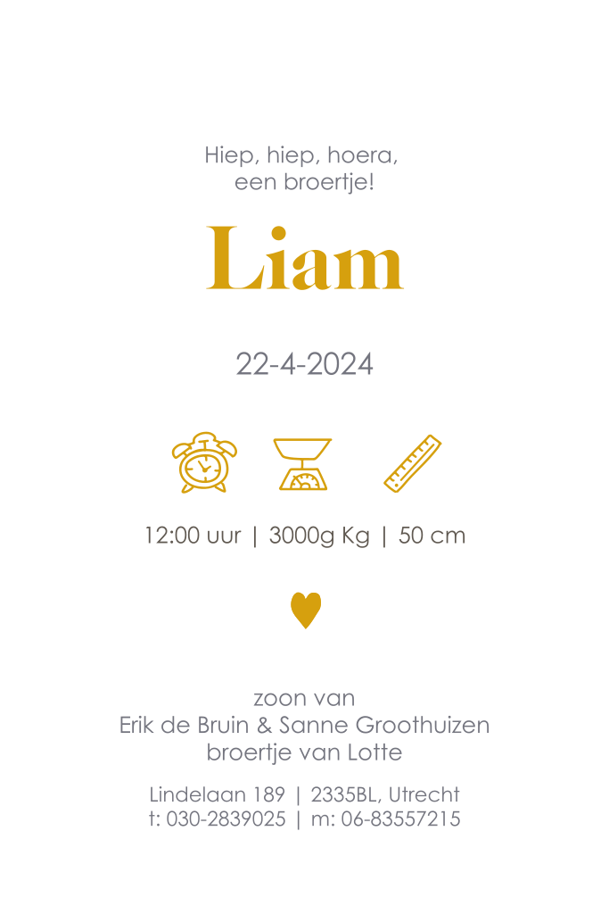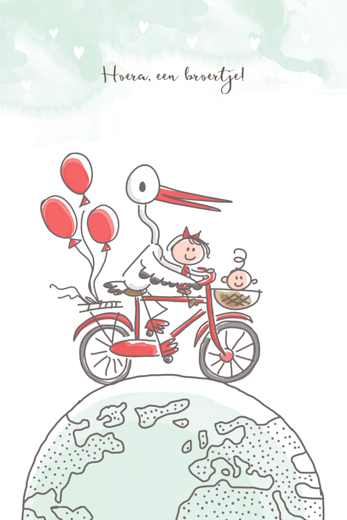 Een lief geboortekaartje met watercolour en goudfolie voor jou zoontje. De baby wordt op de wereld gebracht door een ooievaar op de fiets. Met grote zus voorop en broertje in het fietsmandje rijden ze over de wereldbol. In onze online editor kan je het kaartje naar wens aanpassen.