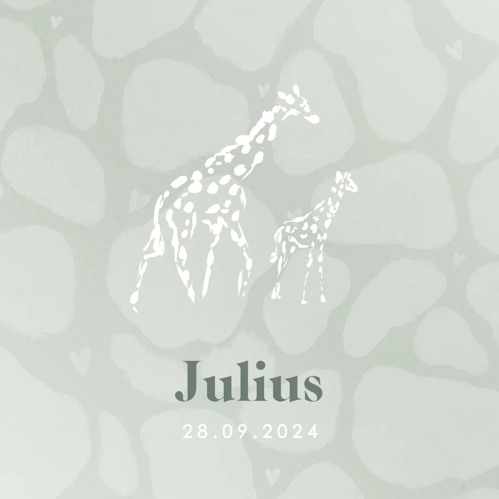 Een ontzettend hip kaartje voor de geboorte van jullie zoontje. Op de achtergrond is een giraffenprintje te zien. In goudfolie zijn er een moeder en baby girafje te zien.