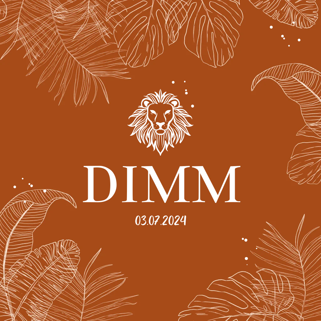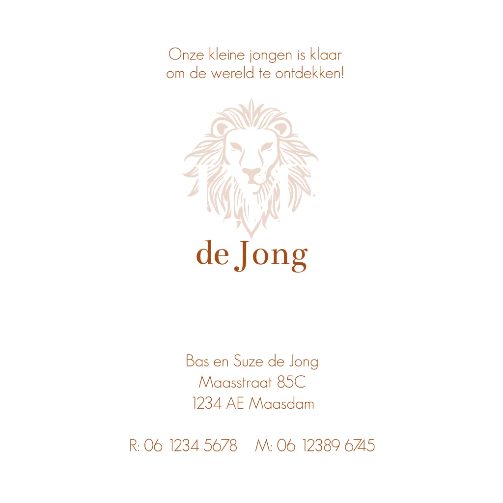 Roestbruin is een echte trendkleur en komt terug op dit hippe babykaartje. Perfect om vrienden en familie te laten weten dat jullie kleintje geboren is. In het midden staat de naam samen met een stoere leeuw in goudfolie gedrukt. De bladeren langs de randen zorgen voor een jungle uitstraling.