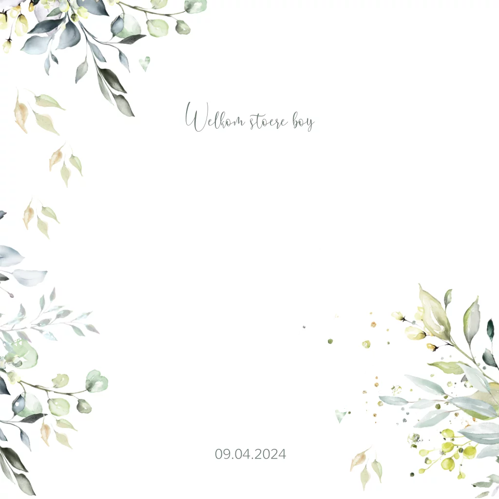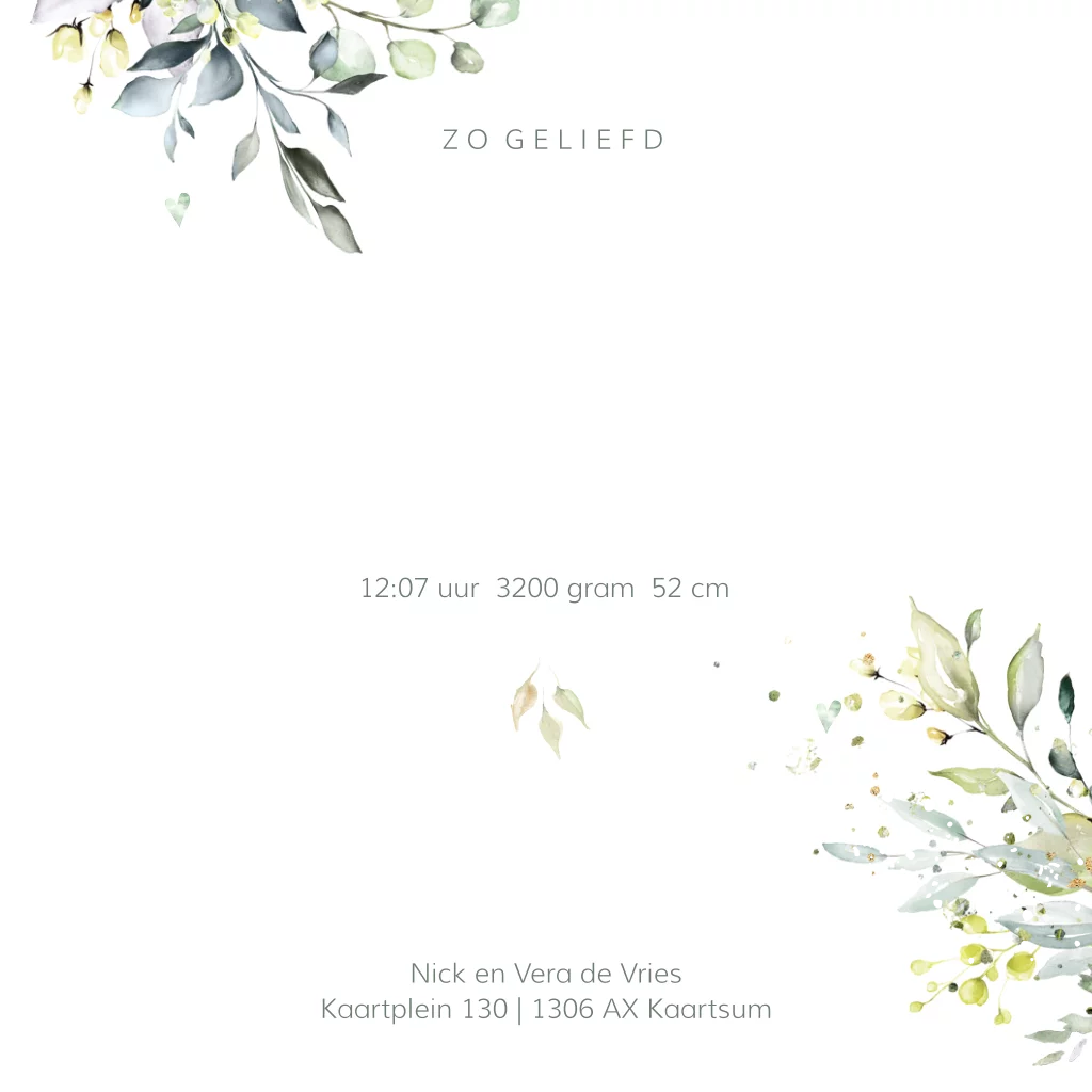 Lief geboortekaartje voor de geboorte van jullie zoon. Centraal staat de naam in het goudfolie, met daaronder een olifant, giraffe en panter. Om deze dieren heen zijn verschillende stijlvolle bladeren te zien.