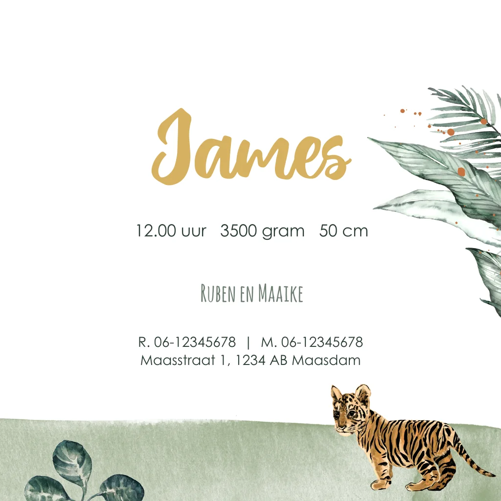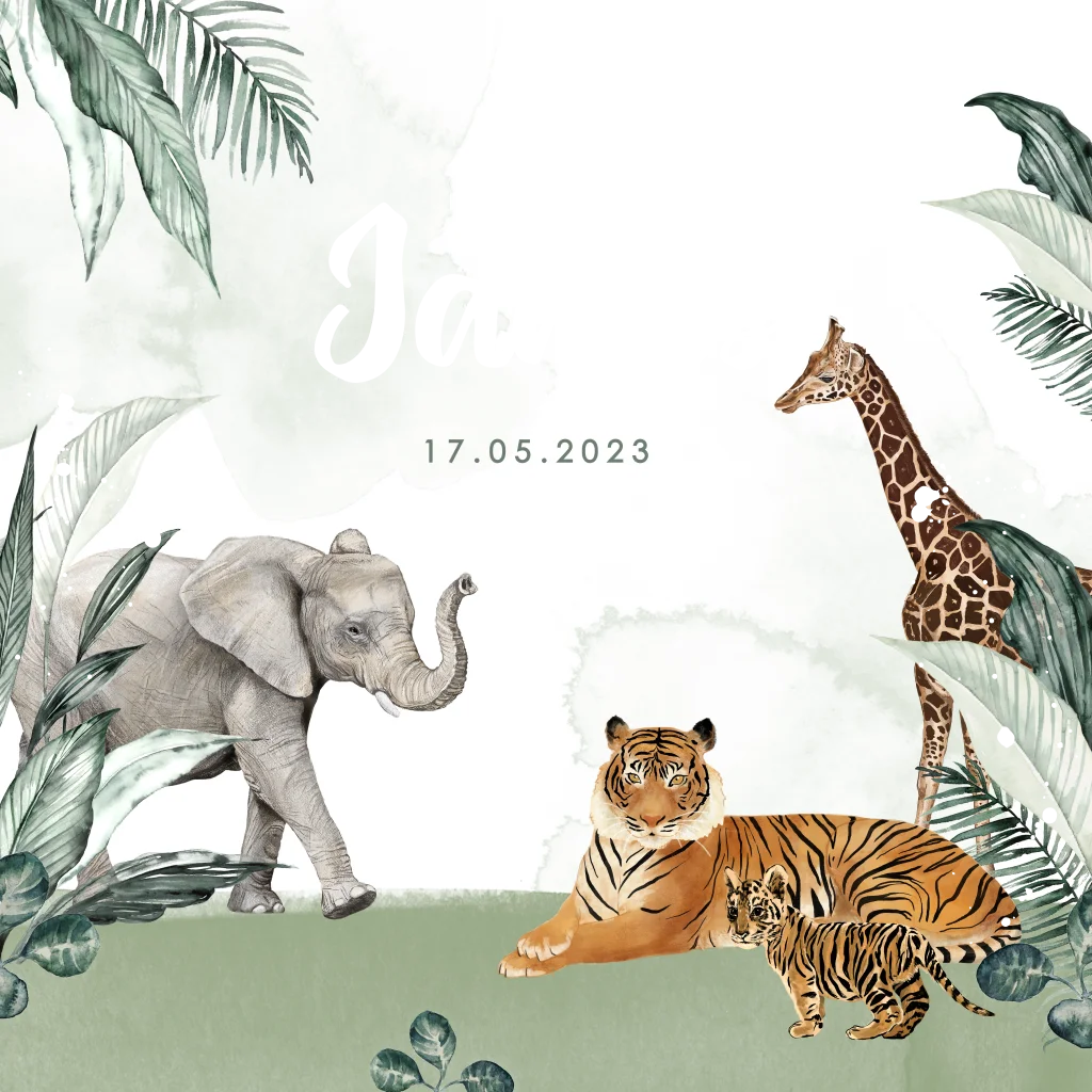 Hip geboortekaartje voor een jongen met groene bladeren, jungle dieren en goudfolie details.