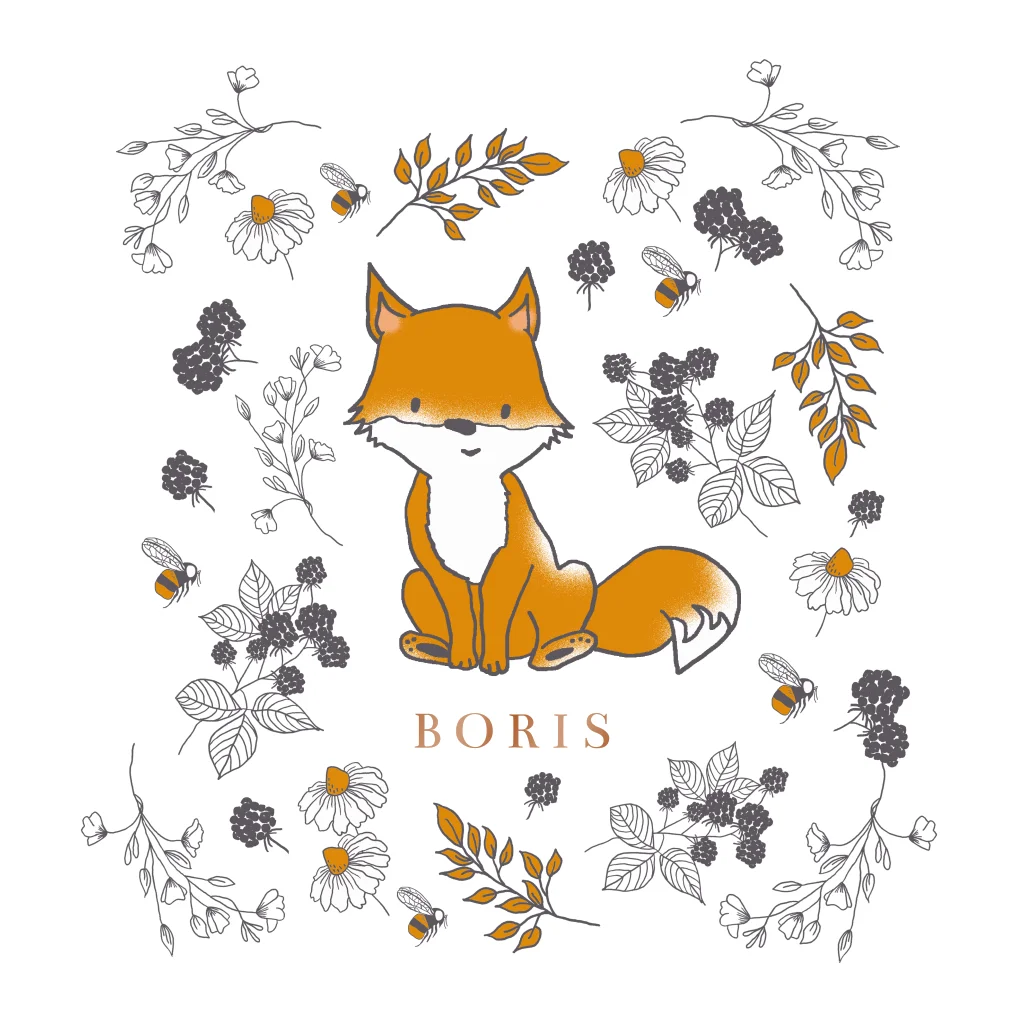 Trendy hoogglans geboortekaartje voor je pasgeboren zoon met lieve illustratie van een vos met botanische bloemetjes en bladeren in natuurlijke herfst tinten.