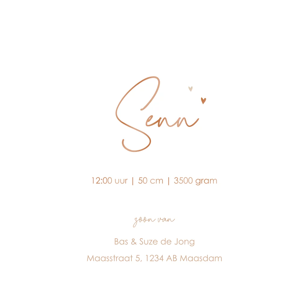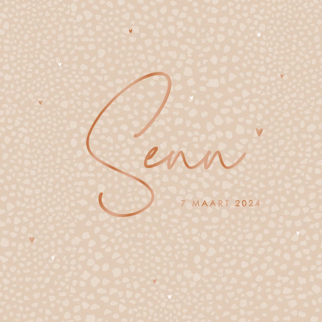 Wat een hip ontwerp voor de geboorte van jullie zoontje. De achtergrond heeft een dierenprint en zachte kleuren. De naam trekt meteen de aandacht in het luxueuze hoogglans. Ook zijn er wat lieve hartjes toegevoegd.