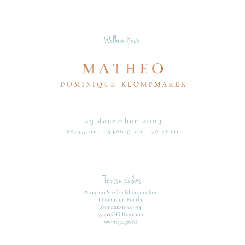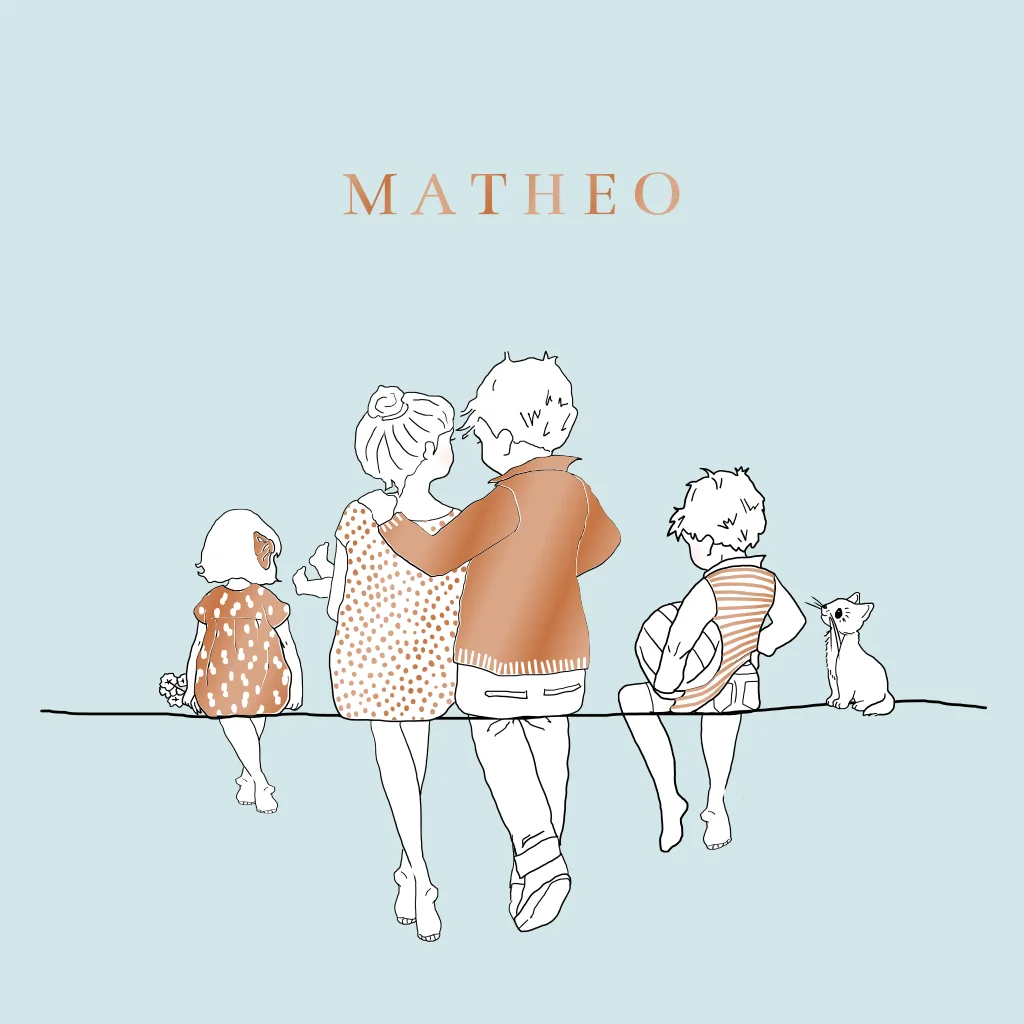 Een lieve kaart voor de geboorte van jullie zoontje. De achtergrond heeft een lichtblauwe kleur. Persoonlijker dan jouw eigen gezinnetje op het kaartje kan haast niet! De hoogglans details zijn prachtig als afwerking.