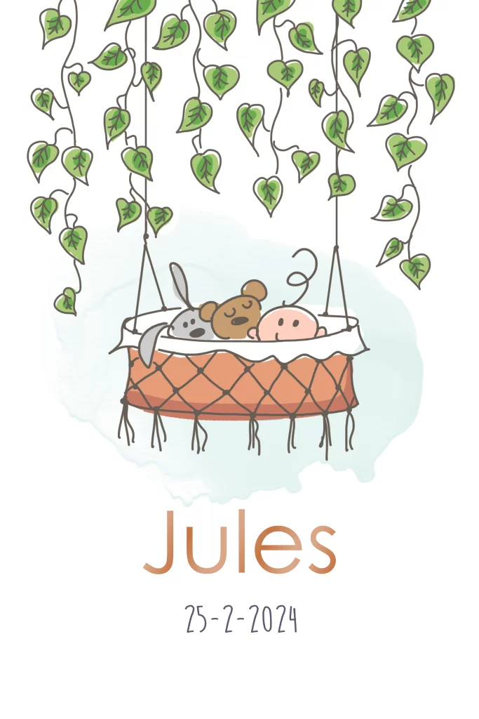 Geboortekaartje voor zoon met hangende wieg tussen planten