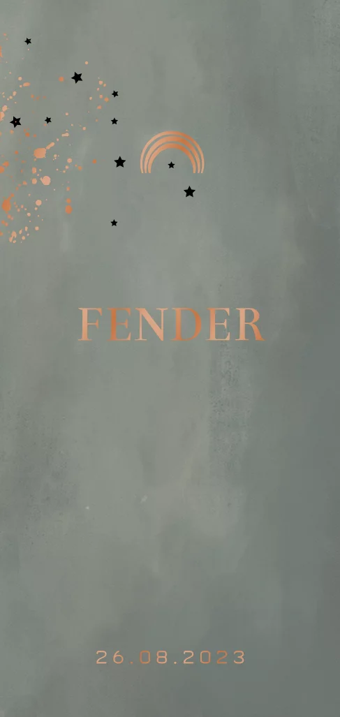 Dit langwerpige groene geboortekaartje is ontzettend stoer. Perfect voor jullie kleine ventje. Het hoogglans zorgt voor een unieke en luxe uitstraling. De naam in het strakke lettertype springt er echt uit. Het regenboogje geeft de stoere kaart een lief element.