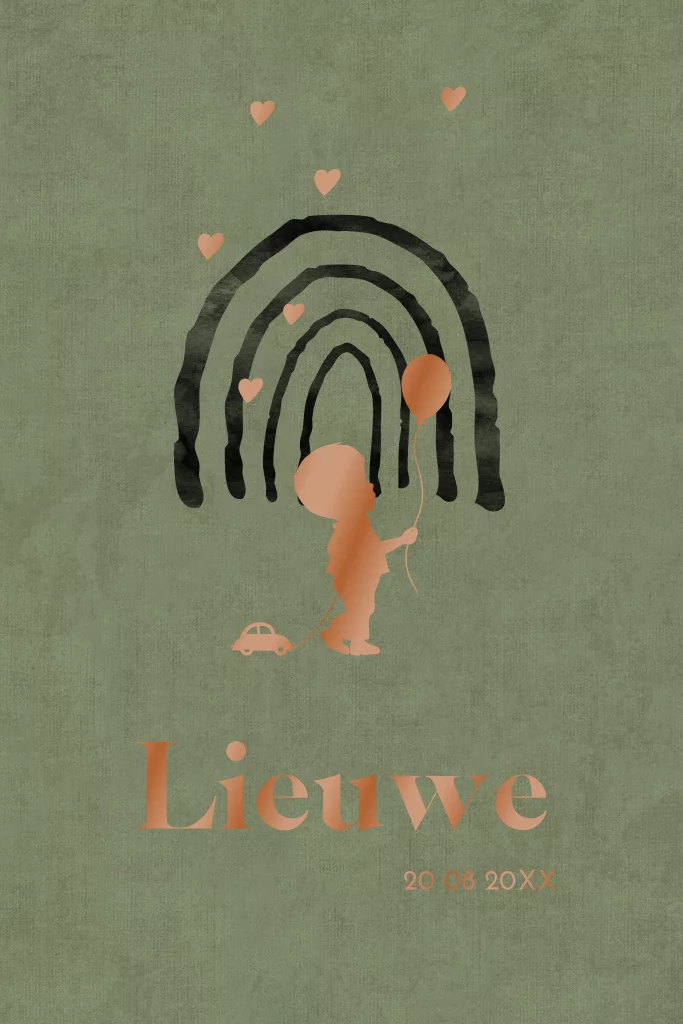 Lief geboortekaartje met echt hoogglans. Een regenboog, hartjes en een silhouet van een jongetje met een ballon. De achtergrondkleur is groen.