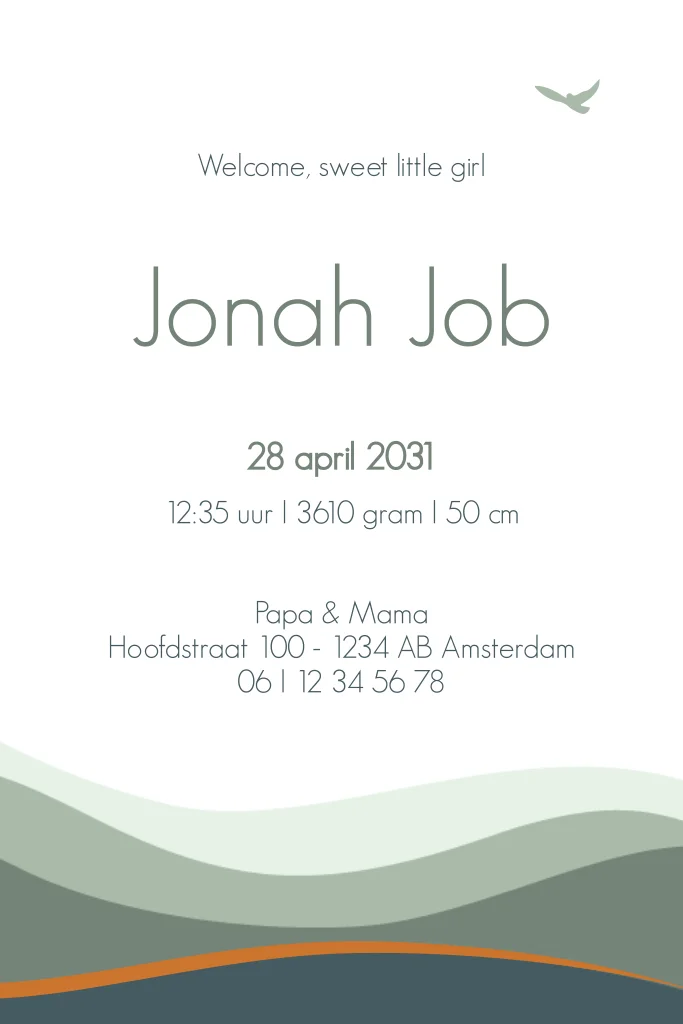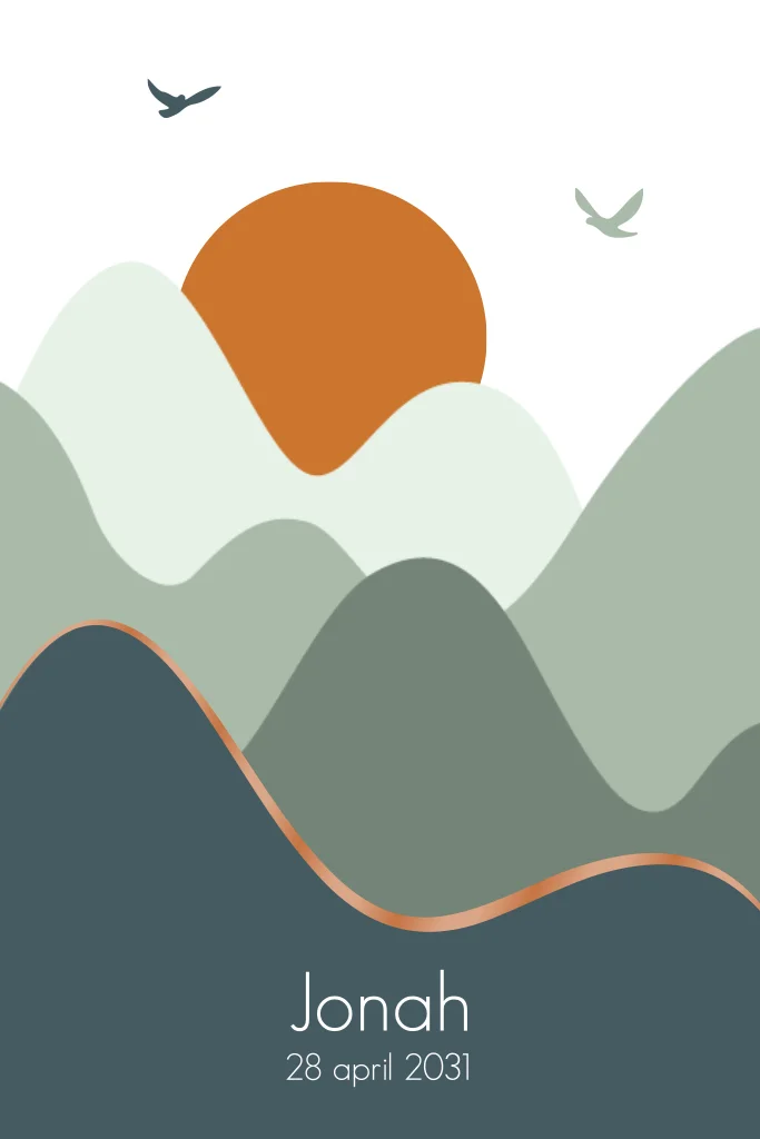 Dit is een stoer geboortekaartje met abstract landschap voor jullie zoon. De kaart heeft verschillende groene kleuren. Bij de zon vliegen twee vogeltjes. Op het kaartje zijn verschillende details gedrukt in hoogglans. Pas het kaartje naar wens aan in onze online editor en bestel snel een proefdruk om dit kaartje in het echt te zien!