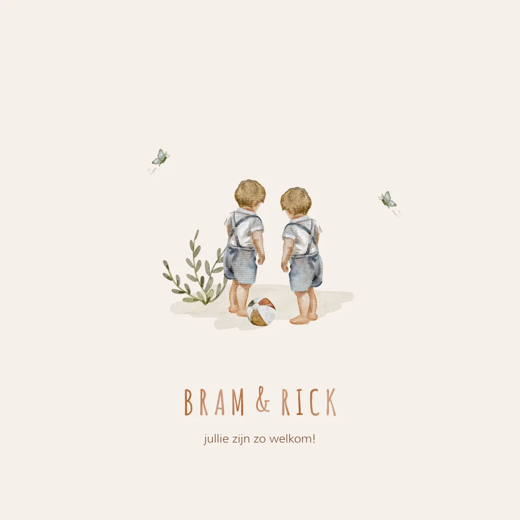 Een hoogglans geboortekaartje voor jouw jongens tweeling. Op het kaartje zie je een schattige illustratie van jouw twee jongens. De twee jongens kijken naar vlindertjes die langs vliegen. De namen zijn in hoogglans gedrukt.