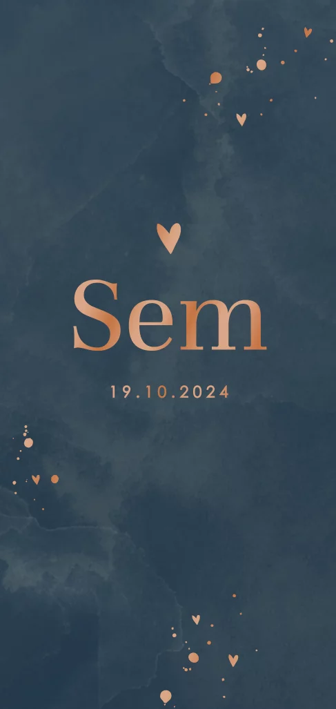 Stoer babykaartje voor je zoon met hoogglans hartje en verfspatten op een achtergrond van donkerblauwe waterverf. Pas de teksten gemakkelijk aan in de online editor en maak zo super makkelijk een uniek geboortekaartje!