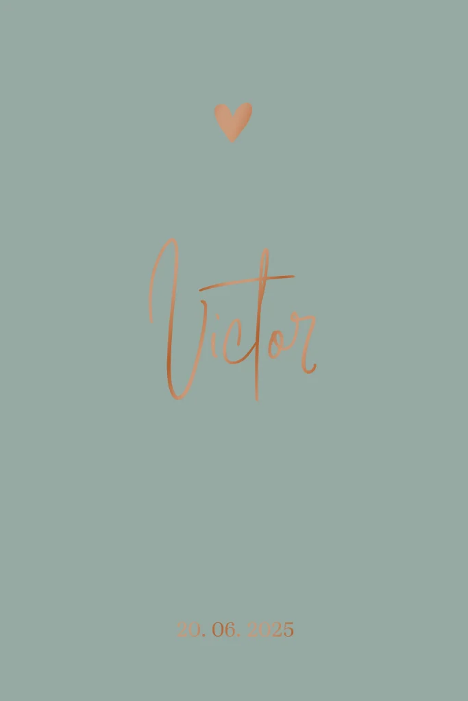 Hip minimalistisch geboortekaartje voor je pasgeboren zoon met een schattig hoogglans hartje op een petrol achtergrond.
