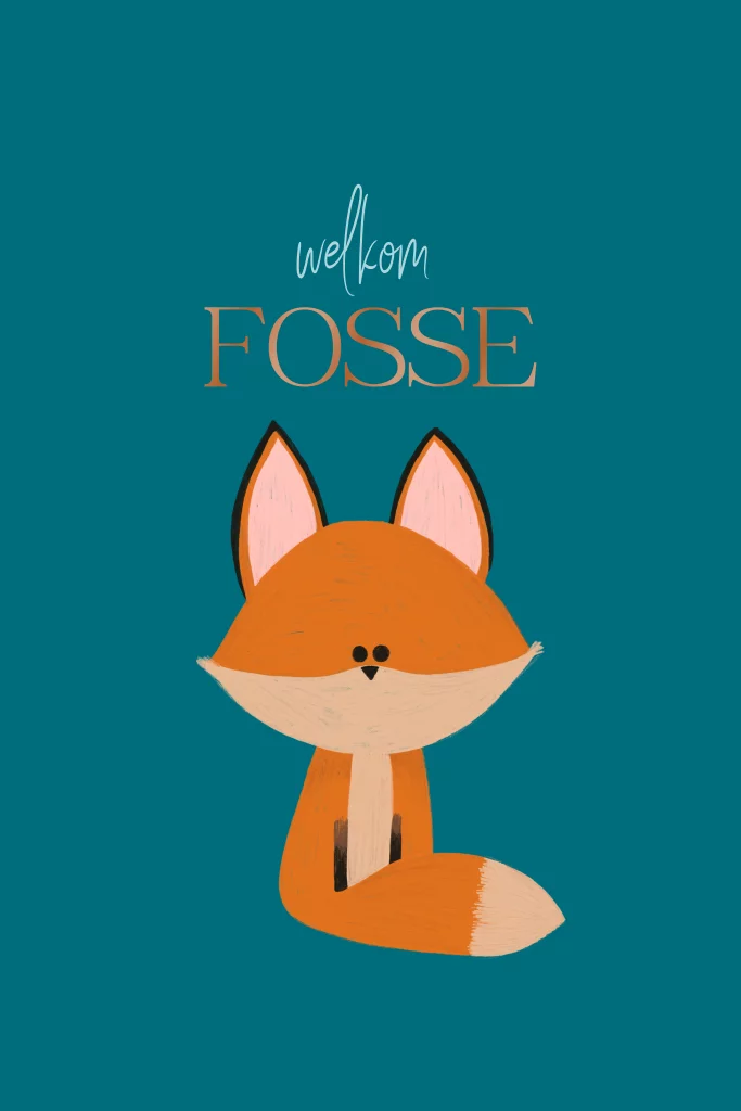 Schattig geboortekaartje voor de geboorte van je zoontje met een lieve illustratie van een vosje op een petrol blauwe achtergrond. De naam van je kindje wordt in hoogglans gedrukt en maakt dit echt een uniek geboortekaartje!