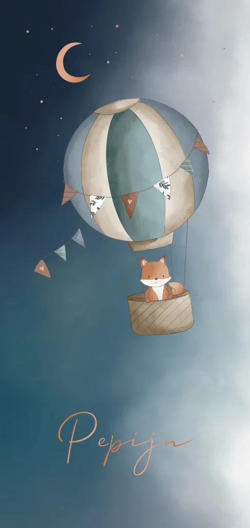Een lief geboortekaartje van een luchtballon die in onder een sterrenhemel vliegt. In de luchtballon zit een vosje. De letters en de sterrenhemel is in hoogglans gedrukt en laat het kaartje echt stralen. Personaliseer dit kaartje voor jullie zoon in onze handige online opmaaktool.