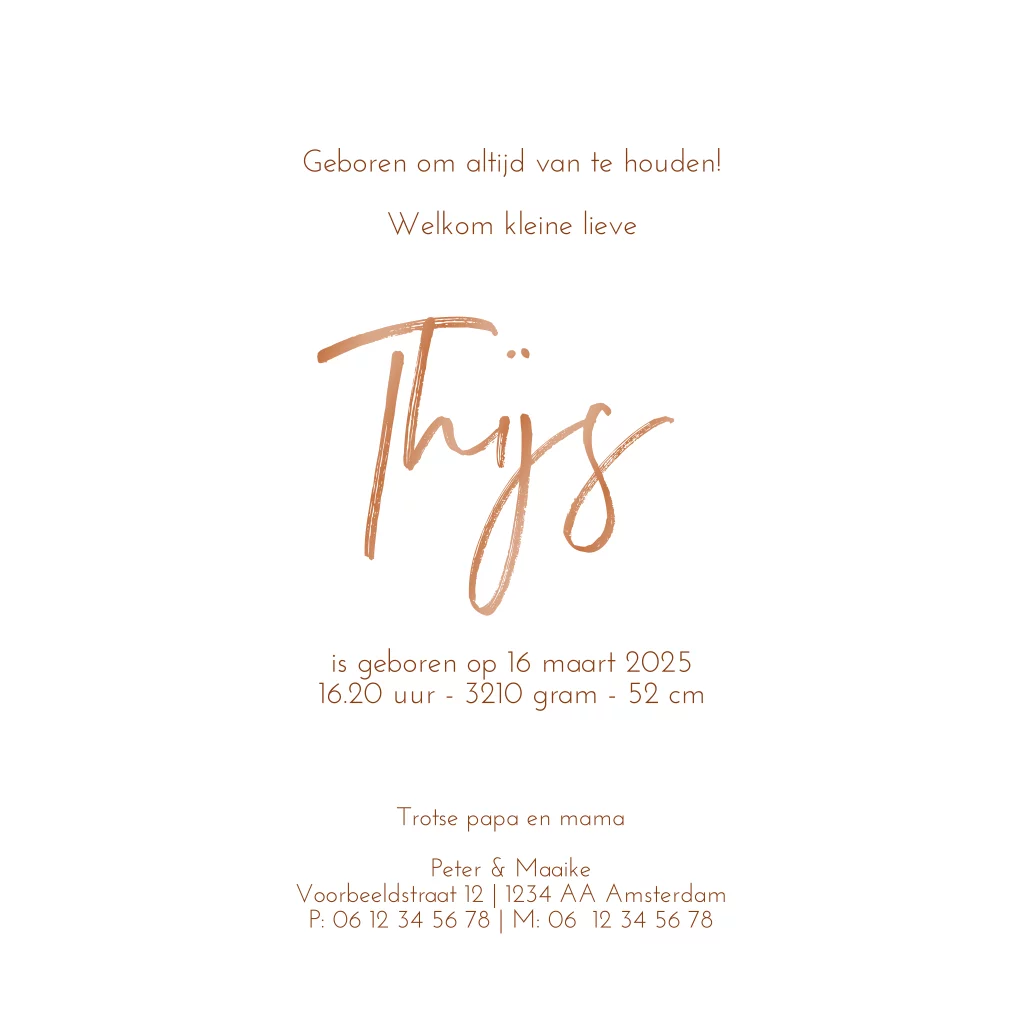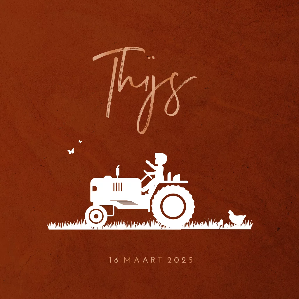 Stoer hoogglans geboortekaartje met silhouet van jongen op de traktor