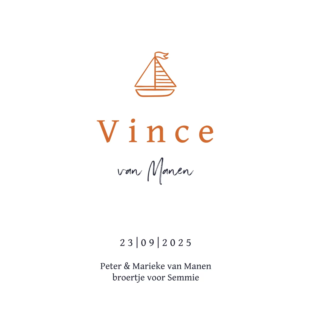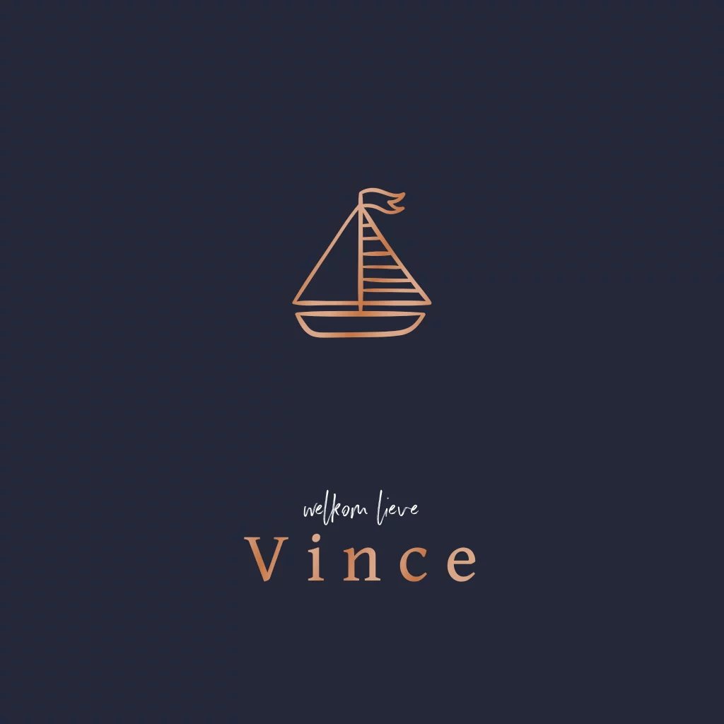 Stijlvol geboortekaartje voor een jongen met minimalistisch ontwerp met een hoogglans zeilbootje op donkerblauw.