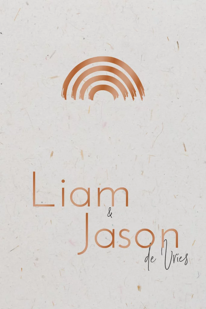 Trendy geboortekaartje voor de geboorte van je tweeling jongens met een hoogglans regenboog op een achtergrond met de look van natuurlijk karton. Dit geboortekaartje is ook leuk voor een tweeling met een jongen en een meisje.