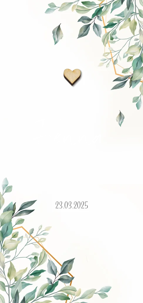 Hip en natuurlijk geboortekaartje voor je zoontje of dochtertje met botanische takjes, geometrische vormen en de babynaam in goudfolie. Bestel het echte houten hartje erbij en maak dit geboortekaartje uniek!