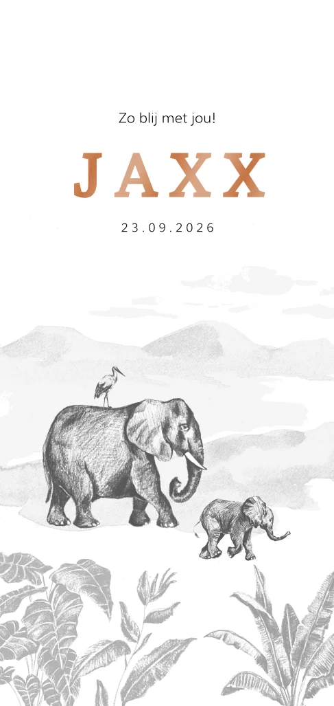 Een uniek zwart-wit kaartje voor de geboorte van jullie zoontje. Er is een moeder olifant met haar kindje op deze kaart te zien. De naam in het hoogglans springt er helemaal uit.