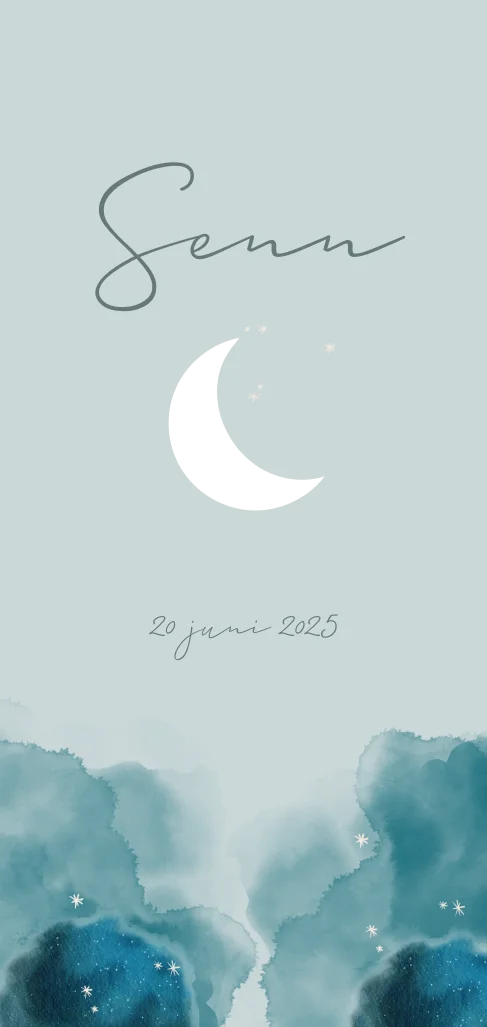 Een dromerig geboortekaartje voor jullie zoontje. Het kaartje heeft een zachte blauwe kleur met verschillende watercolour elementen. Het maantje is gedrukt in goudfolie. Pas dit kaartje volledig naar wens aan in onze online editor.