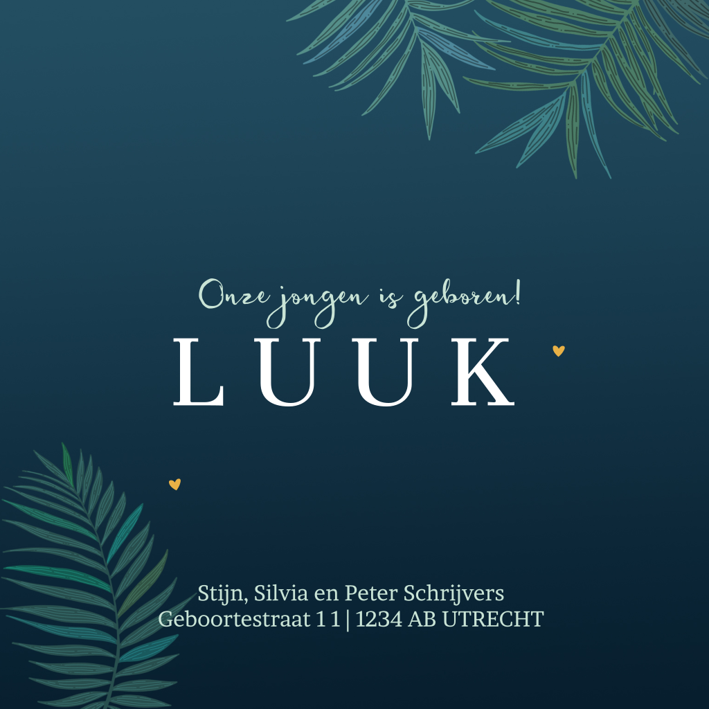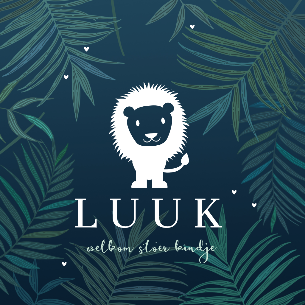 Trendy roségoudfolie geboortekaartje voor je zoontje met een stoere leeuw op een donkerblauwe achtergrond met jungle bladeren. Echt een hip geboortekaartje die helemaal past in de jungle trend!