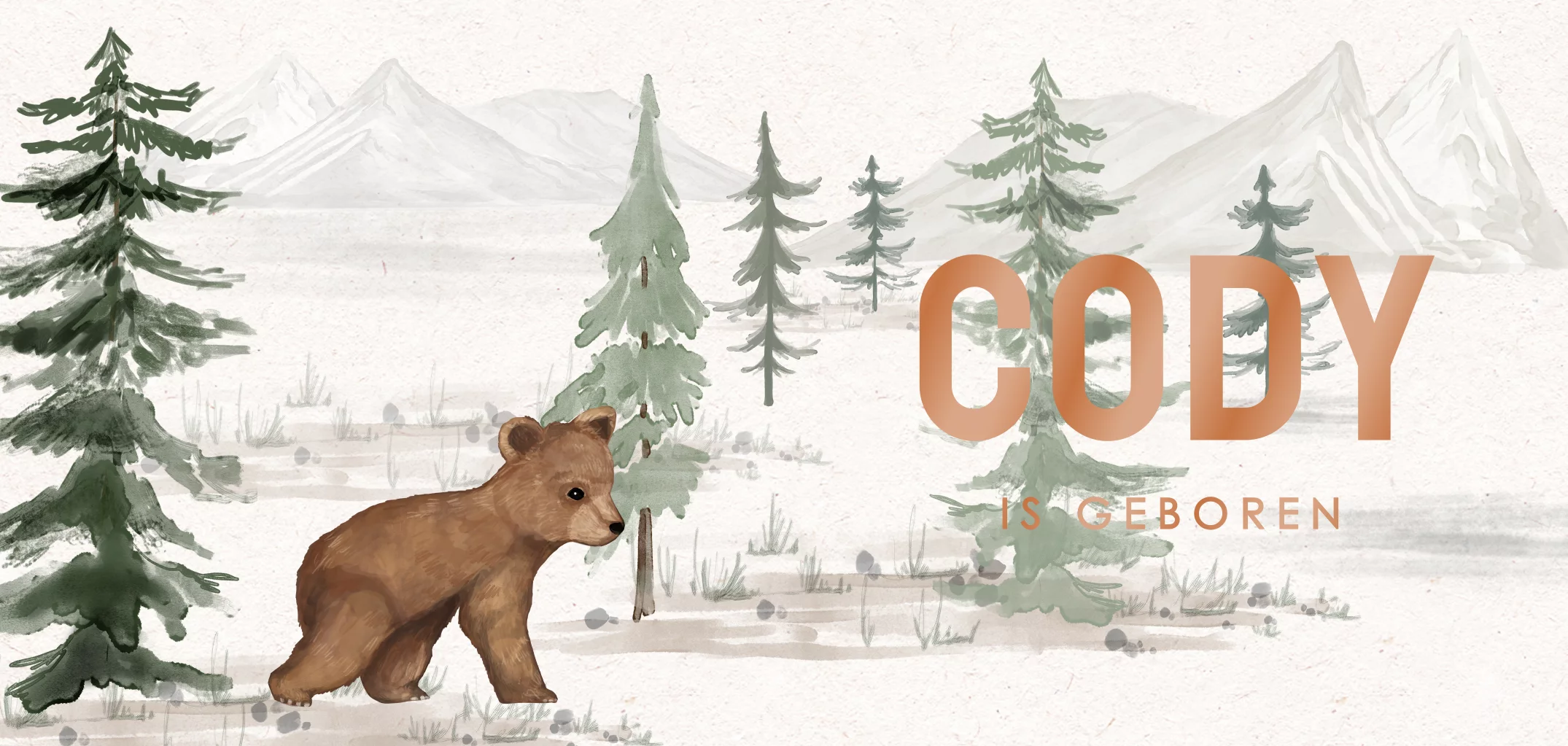 Dit is een stoer kaartje om de geboorte van jullie zoontje aan te kondigen. In een landschap met bomen en bergen staat een klein beertje. De naam en geboortedatum worden gedrukt in hoogglans en geven dit kaartje een warme uitstraling. Pas het kaartje naar wens aan in onze online editor en bestel snel een proefdruk om dit kaartje in het echt te zien!