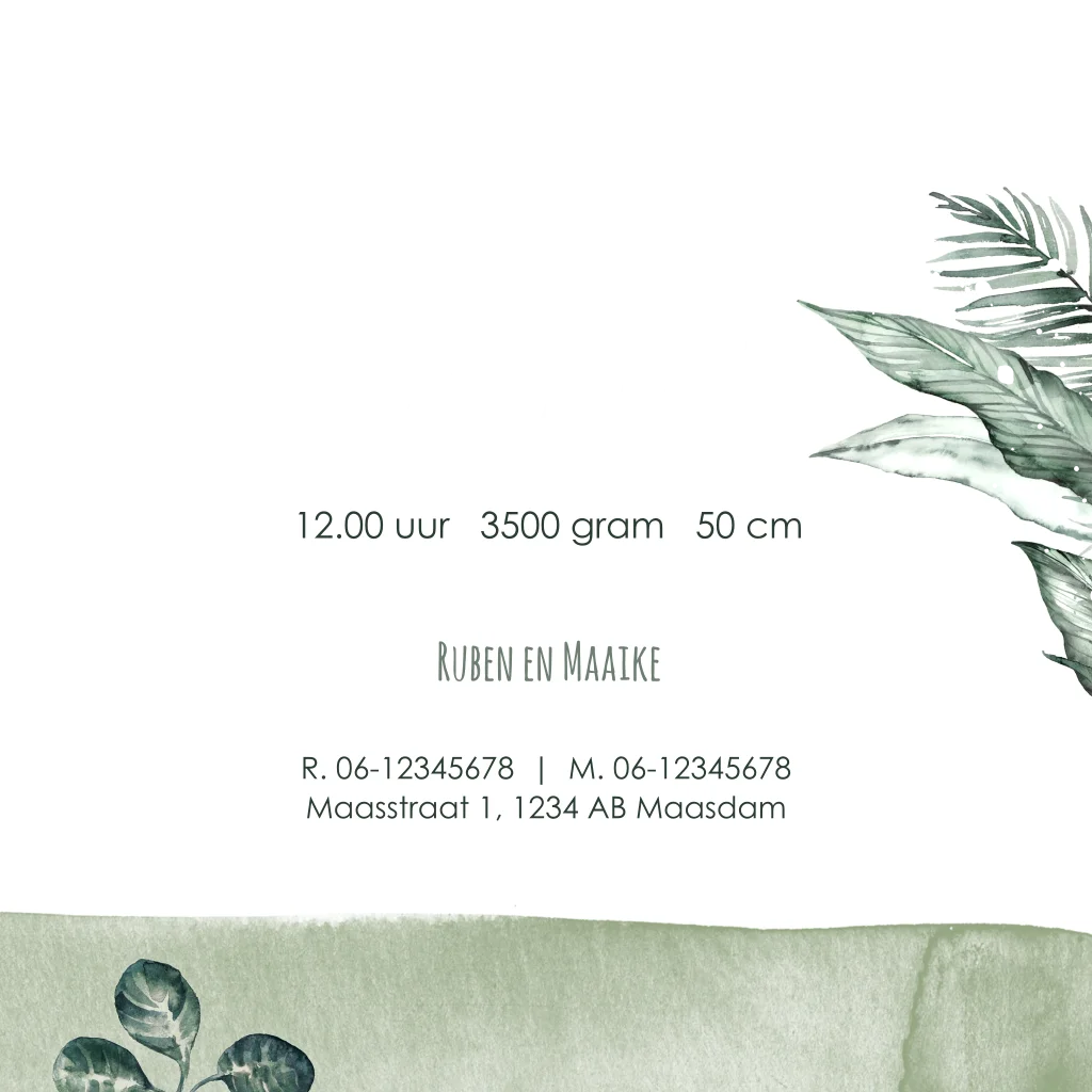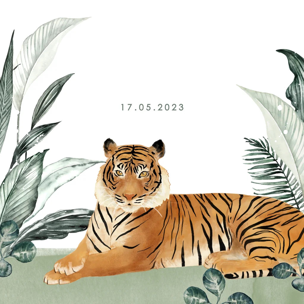 Een hip geboortekaartje voor een jongen met groene takjes en bladeren, een stoere tijger en de naam in goudfolie. Bewerk dit kaartje naar wens in de online editor.