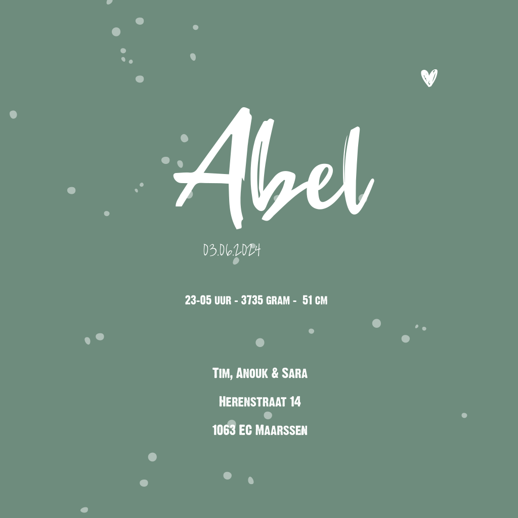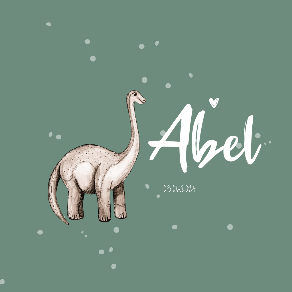 Een trendy, vierkant geboortekaartje voor een jongen met een dino en goudfolie details op een groene achtergrond. Bewerk dit kaartje naar smaak in de online editor.