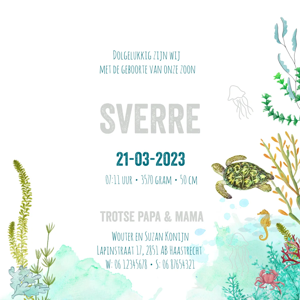 Geboortekaartje jongetje onderwaterwereld met zilverfolie en zeedieren