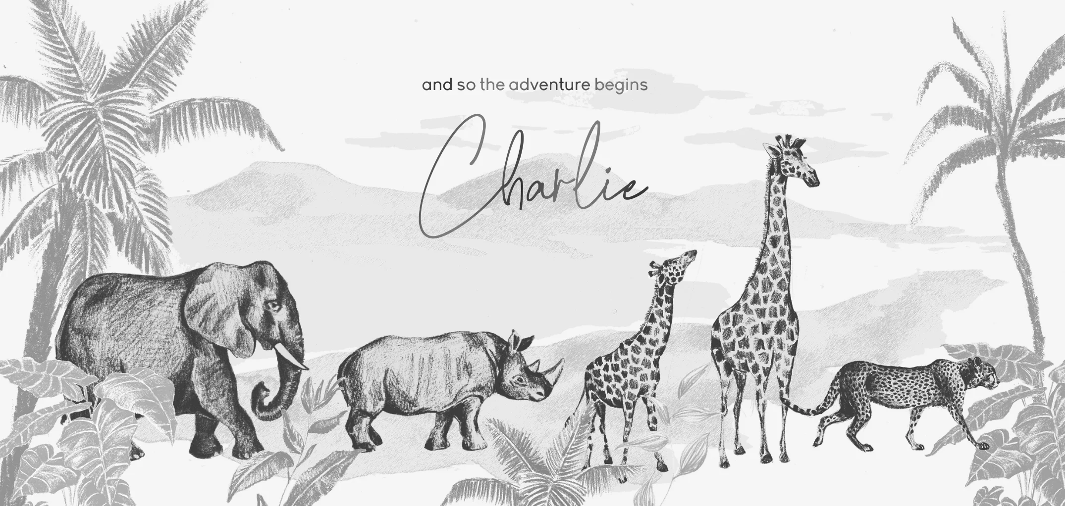 Op dit mooie, handgetekende jungle babykaartje met jungledieren wordt de naam van je zoon gedrukt in zwart folie. Dat maakt het kaartje extra bijzonder! Met illustraties van een olifant, neushoorn, giraffen en luipaard op pad tussen de palmbomen en bladeren.
