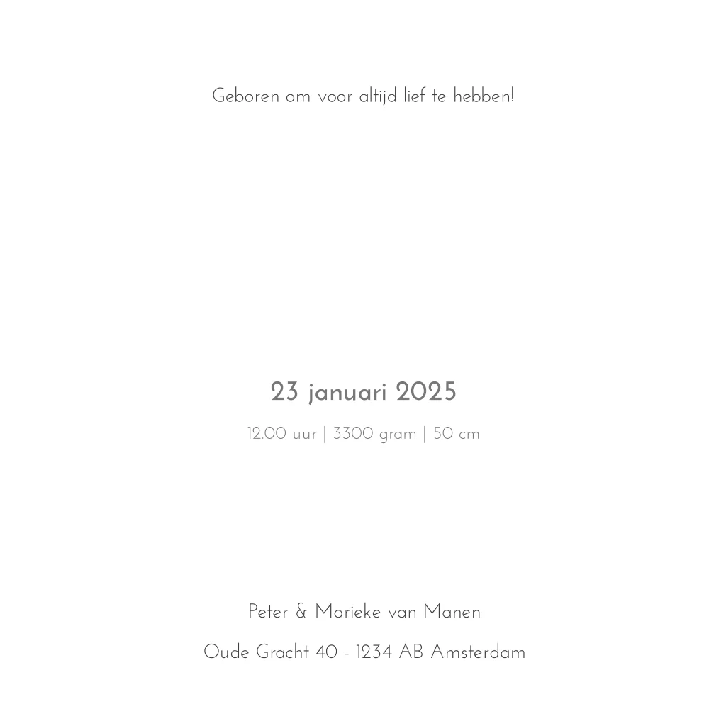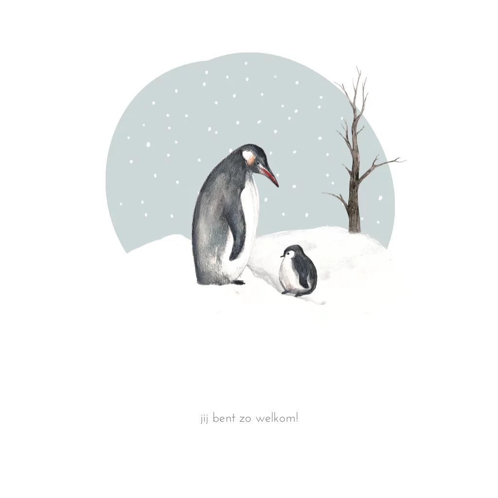 Op dit winterse babykaartje staat een illustratie van een pinguïn met kuiken in de sneeuw in een lichtblauwe cirkel. De naam van jullie zoon wordt gedrukt in zwarte folie.