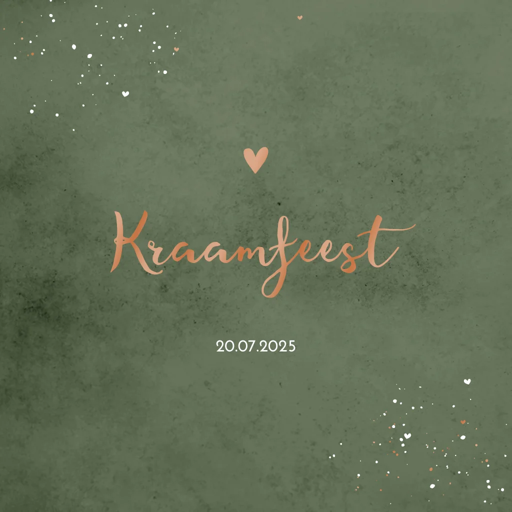 Kondig het kraamfeest van jullie kindje aan met deze mooie kaart. Het kaartje heeft een groene velvet-look achtergrond en een hoogglans hartje. Sommige spetters worden ook gedrukt in hoogglans.
