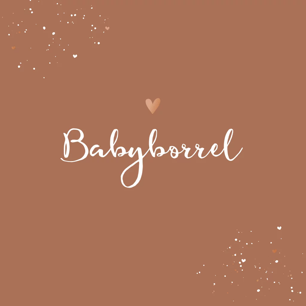 Kondig de babyborrel van jullie kindje aan met deze mooie kaart. Het kaartje heeft een bruine achtergrond met een hoogglans hartje en een aantal hoogglans spetters.