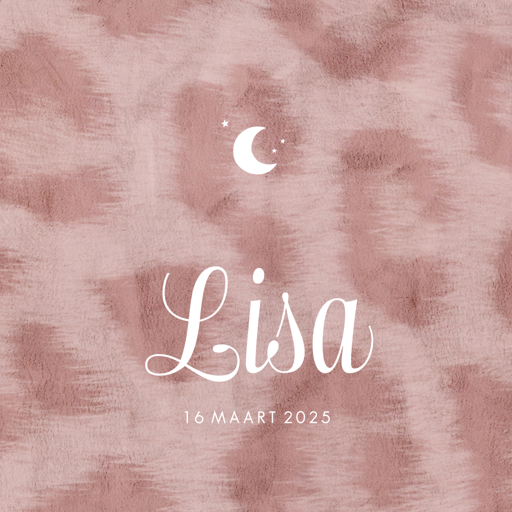 Dit stoere geboortekaartje in oudroze heeft een hippe achtergrond van velvet look panterprint. De naam van jullie dochter en een maantje worden gedrukt in roségoudfolie. Dat maakt het kaartje extra bijzonder! Personaliseer dit kaartje gemakkelijk in de online editor.