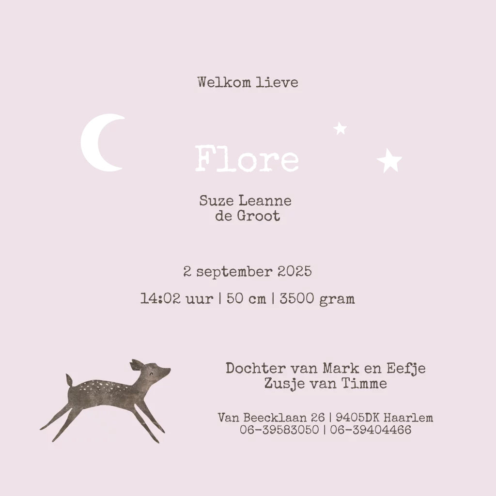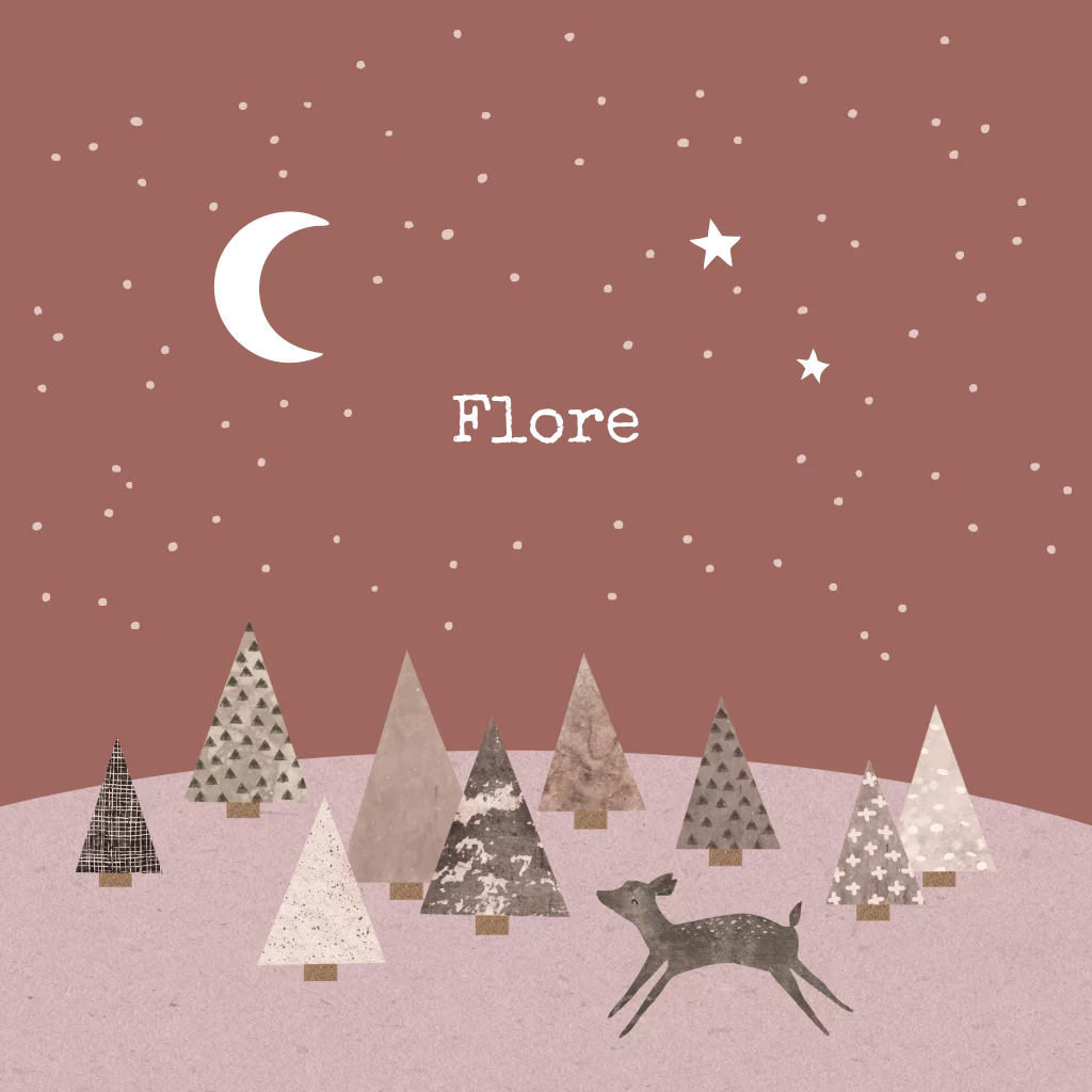 Dit lieve geboortekaartje is extra speciaal met het maantje van koperfolie! Leuk is ook het hertje tussen de boompjes met verschillende patroontjes. Voor een meisje!