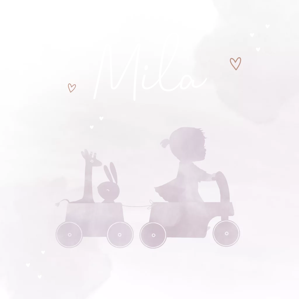 Kondig de geboorte van jullie dochtertje aan met dit luxe kaartje. Het kaartje heeft een paarse achtergrond met het silhouet van een meisje op een kar. Het kaartje heeft roségoudfolie details. Bestel snel een proefdruk om dit kaartje in het echt te zien!
