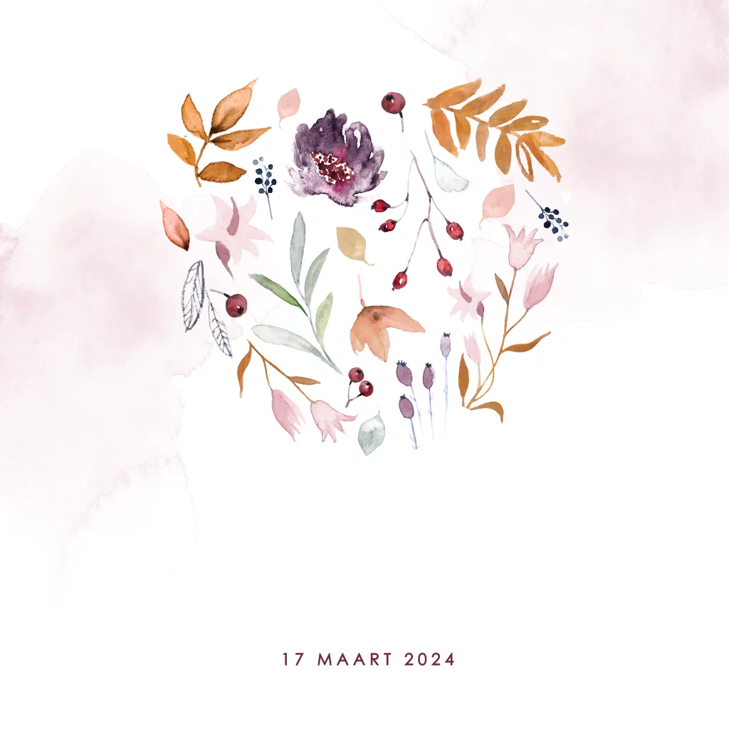 Roségoudfolie geboortekaartje met hart van watercolour bloemen
