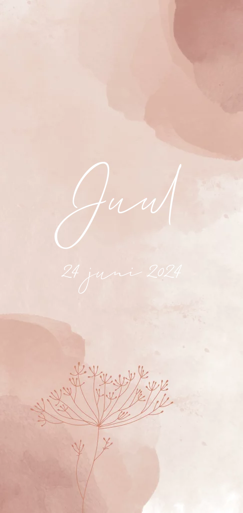 Een stijlvol geboortekaartje voor een meisje met een sierlijk lettertype. Het kaartje heeft een achtergrond met watercolour en een mooi takje. Het kaartje kan je in onze online editor volledig naar wens aanpassen voor jullie dochter.