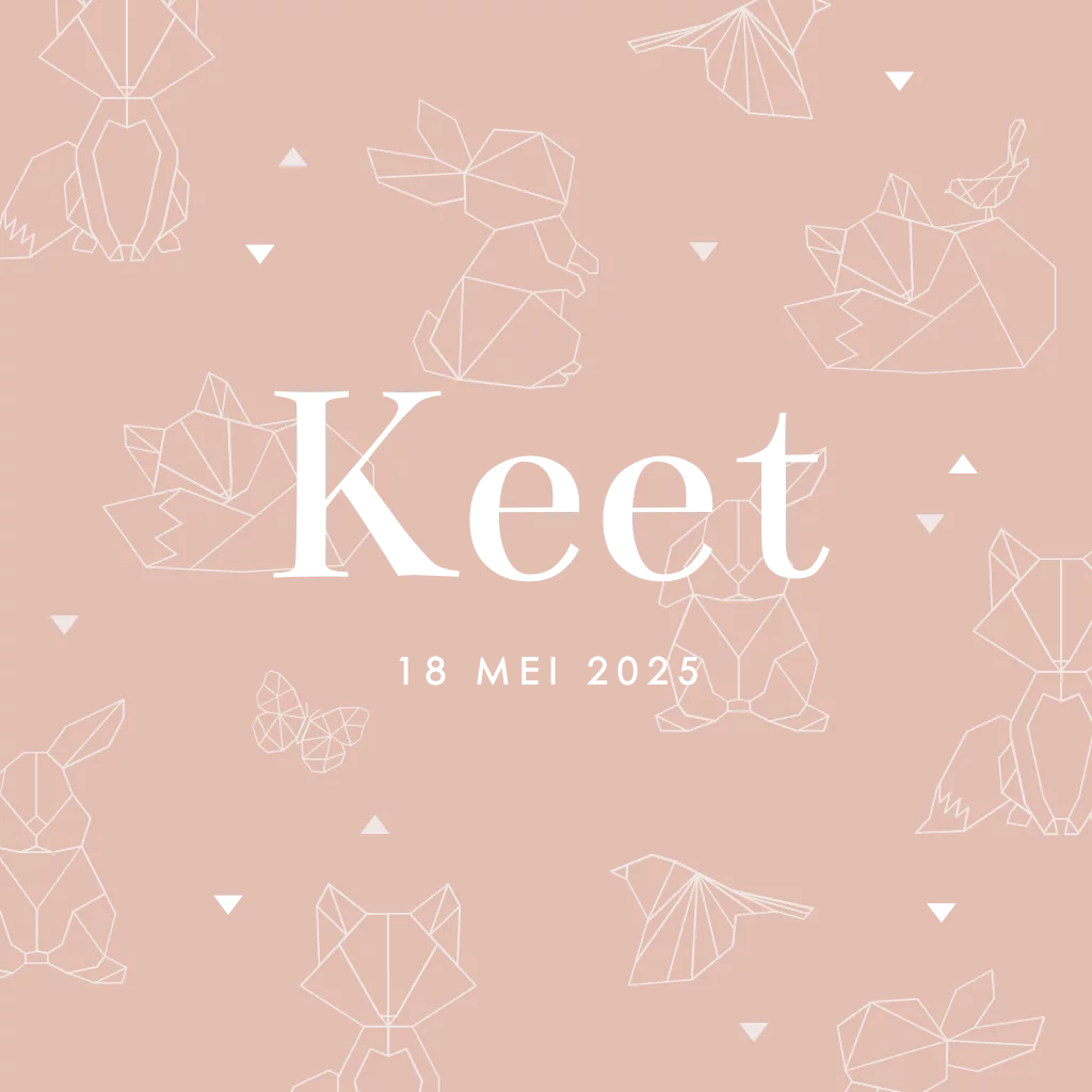 Hip roségoudfolie geboortekaartje met geometrische dieren voor meisje
