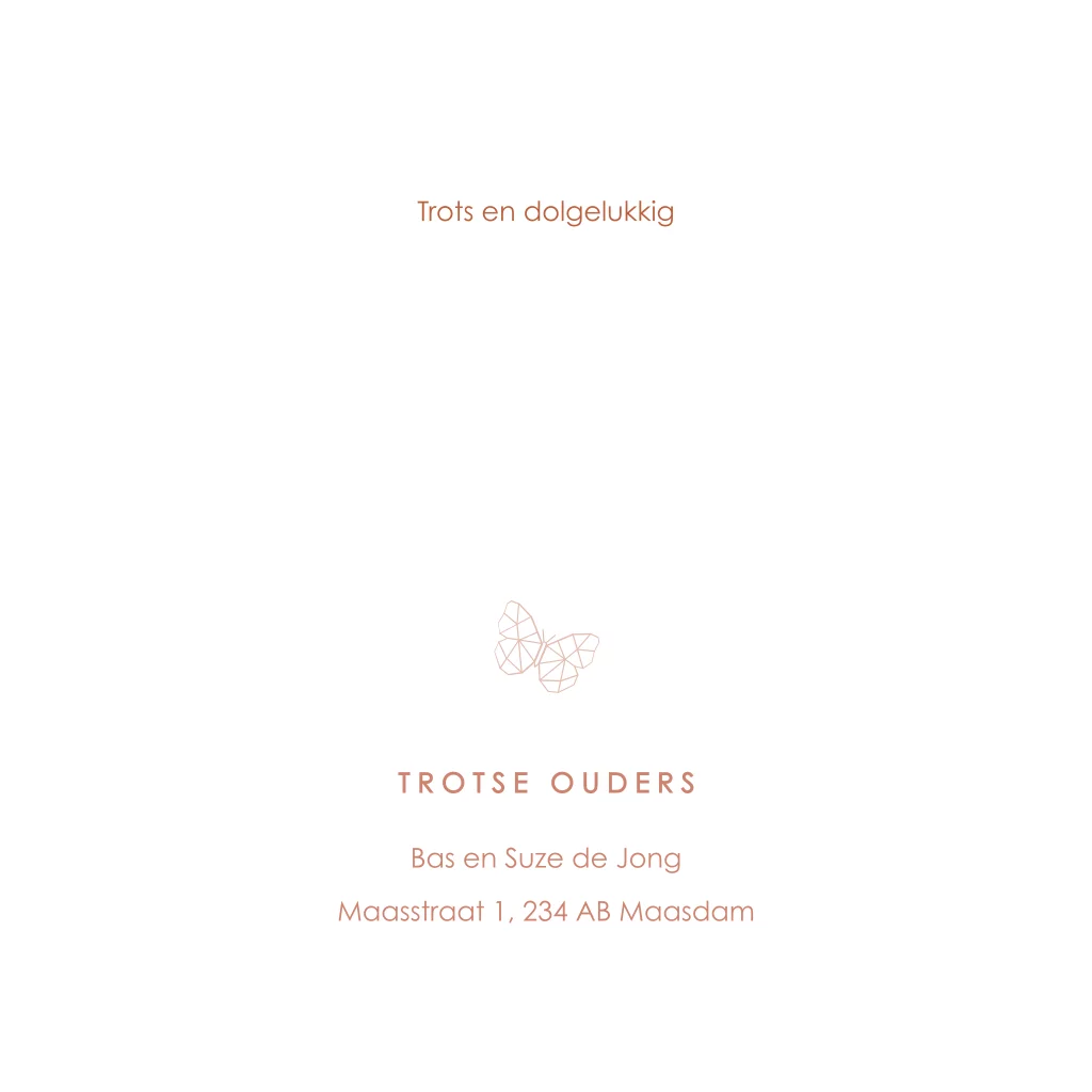 Dit is een luxe kaartje voor de geboorte van jullie dochtertje. De typografie en details in roségoudfolie komen prachtig naar voren tegen de roze achtergrond. De geometrische dieren maken dit kaartje extra uniek. Bestel snel een proefdruk om het kaartje in het echt te zien!
