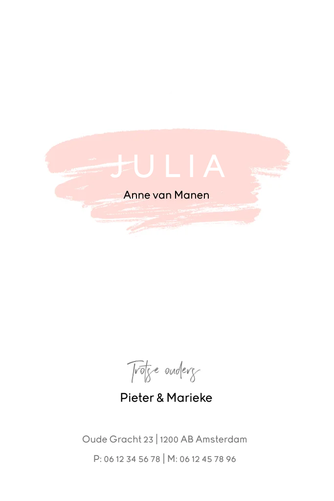 Dit hippe geboortekaartje met roze/peach verfstreep en hartje is super populair. De naam en het hartje zijn zowel op de voor als de achterkant in goudfolie. Bestel snel een proefdruk om te zien hoe hij er in het echt uit ziet!