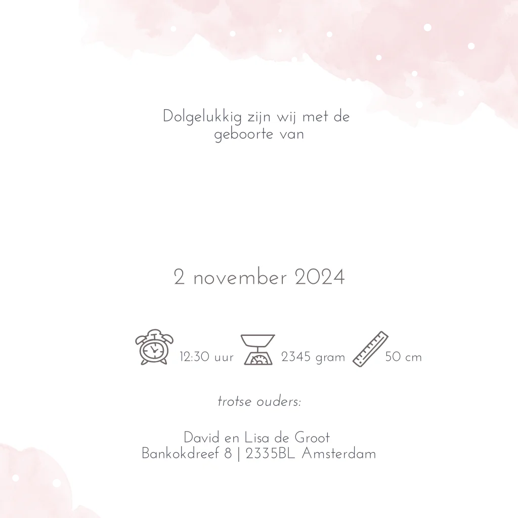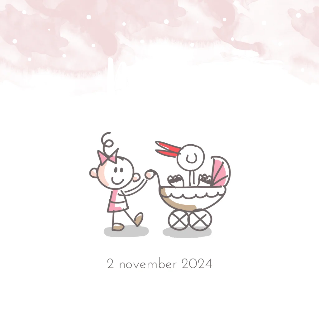 Op dit schattige kaartje voor jullie dochtertje wordt een ooievaar in een kinderwagen geduwd door een meisje. De roze watercolour achtergrond, goudfolie typografie en goudfolie stippen maken dit kaartje helemaal af!