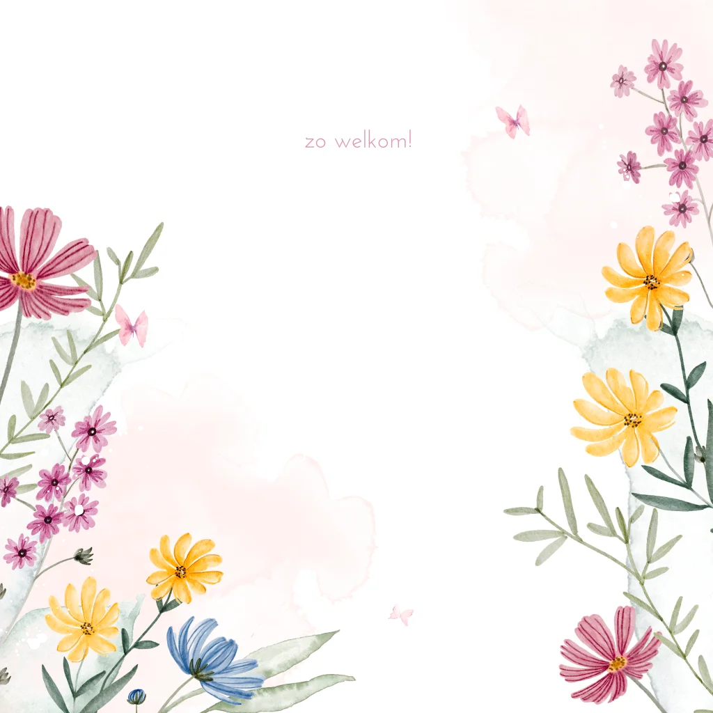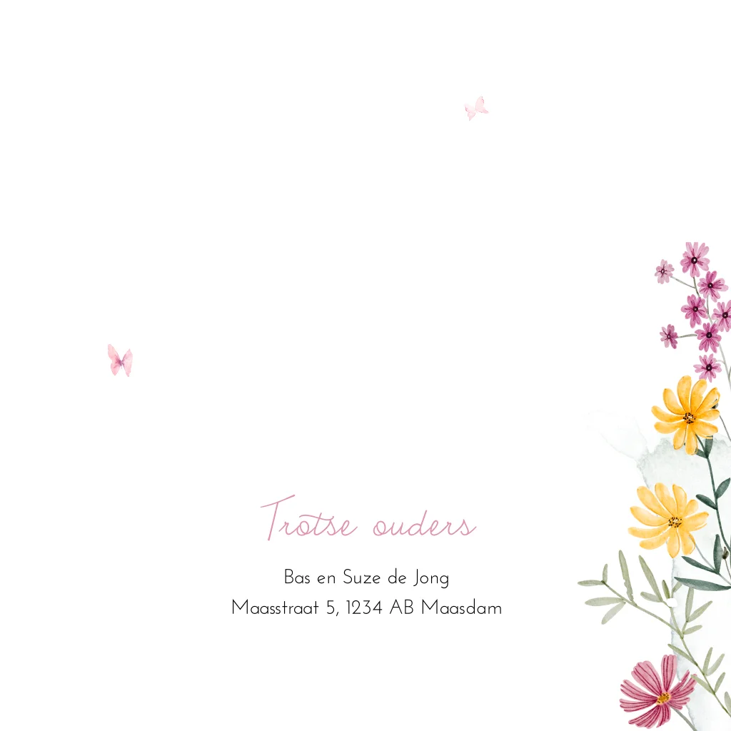Schattig babykaartje met veldbloemen voor de geboorte van je dochter. De naam en geboortedatum worden in goudfolie gedrukt. Het kaartje is naar eigen wens aan te passen in de online editor.